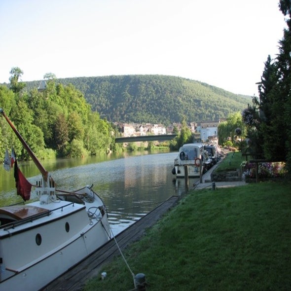 We eten daar en gaan na een half uur verder. Sedan varen we voorbij, daar willen we niet heen deze keer en om 16.30 meren we aan in Mouzon. Net als vorig jaar kunnen we weer helemaal op het eind van de kade aanmeren; voor ons lekker privé en Twan kan lekker achter de boot zwemmen. De dag begon grijs maar na 4 uur kregen we zonnige perioden en een aangename temperatuur.
