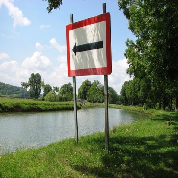2-7 Na het eten ga ik eerst een eind met Twan lopen, zonder fototoestel en dat is dom, want er is zo vaak iets te zien dat ik het vastleggen waard vind. Als ik Twan weer naar de boot heb gebracht, doe ik de zelfde wandeling nog maar een keer en nu met fototoestel. Ik kom bij een spoorwegovergang en daar staat dit waarschuwingsbord naast de weg.