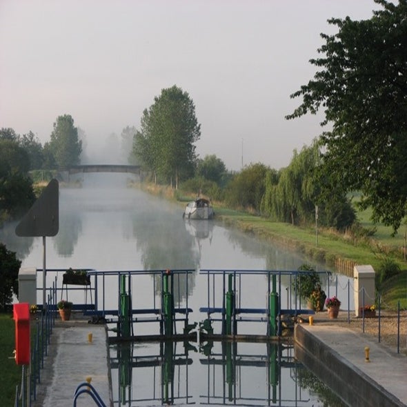 5-7 's Morgens fiets ik eerst naar Euville, op ruim 1 kilometer, voor brood, maar het depot de pain, dat er vorig jaar nog was is er niet meer. Volgens een bord moet er na een paar autominuten een supermarkt zijn. Dat klopt, maar die gaat pas om 8 uur open, dus nog 20 minuten wachten. Ik ben zowat bij Commercy en daarom rijd ik maar door en koop daar mijn baguettes. We vertrekken uiteindelijk om 10.15, na eerst nog water getankt te hebben. Om 12.15 meren we aan bij Pagny-sur-Meuse. We hebben dan de laatste sluis van de Maas gehad en zitten op het canal de la Marne-au-Rhin. Het is strak blauw en 30 graden. We eten daar, laten Twan uit, en ook even zwemmen en daarna gaan we verder. Een man vraagt of we wel weten dat we nog 12 sluizen krijgen tot aan Toul, 'ja dat weten we', maar eerst komt de tunnel van Foug, ruim 800 meter lang. Bij de dubbele sluis na de tunnel moeten we onze afstandsbediening inleveren en wachten op een boot van de andere kant. (Om water te besparen tijdens het schutten loopt de helft van het water van de ene in de andere sluis. Waarom is me een raadsel want bij de sluizen hierna laten ze het water gewoon constant over de deuren weglopen.) Om 14.30 zijn we door de sluis en twee uur later meren we aan in de haven van Toul, 11 sluizen en 8 km verder. Het is warm en het mag wel niet, maar onderweg, als we in een sluis lagen en de deuren bezig waren om dicht te gaan, sprong ik soms gauw even achter de boot in het water.
