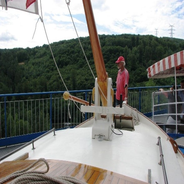 14-7 Na het nuttigen van een paar plakken schwartsbrot met jam en een kop thee laat ik Twan uit en als ik met hem langs het kanaal loop komt er een boot langs. 'Hé, de sluizen zijn toch gesloten, waar komt die weg? Misschien toch van deze kant van de sluis.' Later ga ik toch maar eens kijken of hij voor de sluis ligt, maar hij is weg en de lichten van de sluis staan op enkel rood; meestal een teken dat ze bediend worden. Als er ook nog een huurboot langs komt vraag ik maar eens of er gewoon gevaren kan worden en zij zeggen dat er geen belemmeringen zijn en blij verrast start ik daarom gauw de motor en vaar naar de volgende sluis waar we samen met de huurboot schutten, evenals bij de volgende 2 sluizen en dan zijn we weer bij de Scheepslift van Saint-Louis-Arzviller. De mensen van de huurboot maken een gebaar dat we ze maar voorbij moeten varen, zij gaan niet mee naar boven. De bak komt net naar beneden met een rondvaartboot en als die uitgevaren is kunnen wij er direct in en in ons eentje gaan we in de bak naar boven (filmpje). Boven staan een boel toeschouwers en wanneer we daar aangekomen zijn, krijgen we applaus, net alsof we met een vliegtuig geland zijn. Om 13.00 uur meren we aan bij Hesse op de zelfde plek waar we op de heenweg ook lagen. We eten daar en ik loop even een rondje met Twan waarna we verder gaan. Twee kilometer verder zijn we bij de Saar en steken die over via een aquaduct.