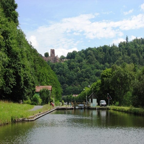 13-7 We vertrekken om 7 uur. Martha vindt Lutzelbourg zo'n mooi plaatsje en daar wil ze graag liggen op 14 juli, omdat op die dag iedereen vrij en alles gesloten is, dus we kunnen dan niet varen. Het is nog warm, maar grijs en als we Saverne voorbij zijn begint het af en toe te miezeren en vlak voor Lutzelbourg houd het op met zachtjes regenen.