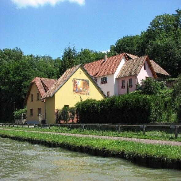 Aan de andere kant van Saverne is de jachthaven. Daar ligt ook de Sepia en als wij langs komen maakt die de touwen los en vaart achter ons aan. Na Saverne zijn weer automatische sluizen, maar die werken niet met zo'n afstandsbedieningen ook geen slang waar je aan moet draaien, maar een slang waar je aan moet trekken. De eerste keer trek ik waarschijnlijk niet hard genoeg, dus doet de bemanning van de Sepia dat nog eens dunnetjes over. We passen mooi met zijn tweeën in de sluis. Het blijkt steeds een soort sluizentrap/ketting te zijn. Bij de eerste sluis trek je aan de slang en daarna worden een aantal dicht bij elkaar liggende sluizen automatisch voor je bediend, je moet nog wel de blauwe stang omhoog duwen als je in de sluis ligt. Bij sluis 41 meren we aan om te eten. We liggen dan net voor de laatste sluis van de sluizentrap en als na het eten er een boot aankomt, sluiten wij er gauw achteraan en schutten zo mooi mee. De huizen gaan er steeds meer Duits uit zien in de meest fantastische kleuren, zoals verschillende tinten geel, groen, soms gifgroen, paars, rose en blauw, soms ook met prachtige muurschilderingen.