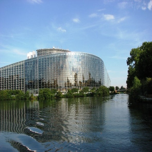 12-7 We vertrekken vroeg vanmorgen. Al om 6.45, want het zal warm worden vandaag, er is geen bakker in de buurt dus daar hoef ik niet heen en we willen niet in Straatsburg overnachten, dus we moeten nog weer een eindje dezelfde weg terug. Dichter bij Straatsburg komen de gebouwen van het Europese parlement al in zicht.