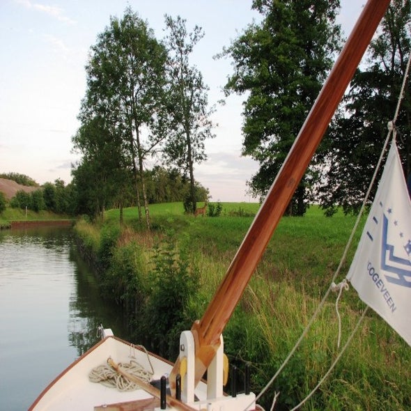 27-7 De hele haven is nog in rust als we vertrekken en daarom gaan we heel stilletjes om 6.45 de haven uit. Het is nog 3 km stroomafwaarts op de IJssel en ik zet de marifoon aan op kanaal 22 van de spooldersluis. Ik hoor dat een schip, komende vanaf het Zwarte Water zich meld, maar ook, dat er net een schip naar de IJssel geschut wordt. Als ik de sluis in zicht heb vaart die net uit. Ik meld mij bij de sluis en kan zo invaren. In de sluis strijk ik het mastje maar even zodat ik onder de brug door kan en al snel varen we op het Zwolle-IJssel-Kanaal. De tocht verloopt voorspoedig en het is lekker weer, dus nu is het ook hier in Nederland een genot om te varen. Na Zwarte Water en Meppelerdiep komen we weer op de Hoogeveense vaart. Nu heet hij kennelijk echt Hoogeveense Vaart, want tot voor kort stond bij de aansluiting op het Meppelerdiep aan de ene kant een bord met Hoogeveense Vaart en aan de andere kant Hoogeveensche Vaart en dat laatste bord is nu dus vervangen door een bord met de nieuwe schrijfwijze. Om twaalf uur meren we aan in het haventje van Rogat om te eten. Om 15.45 zijn we thuis en meren daar aan.